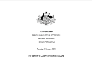 - IMF CONFIRMS LABOR’S JIMFLATION FAILURETED O’BRIEN MP DEPUTY LEADER OF THE OPPOSITION SHADOW TREASURER MEMBER FOR FAIRFAX MEDIA RELEASE The International Monetary Fund (IMF) has delivered a blunt warning on the Albanese Government’s economic mismanagement, calling out Australia for the “drawn-out persistence” of above-target inflation. This confirms what Australian families, the banks and the Reserve Bank already know. Under … Continued