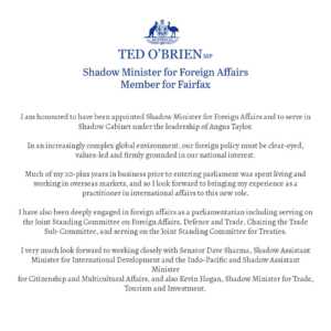 - STATEMENT ON APPOINTMENT AS SHADOW MINISTER FOR FOREIGN AFFAIRSTED O’BRIEN MP SHADOW MINISTER FOR FOREIGN AFFAIRS MEMBER FOR FAIRFAX I am honoured to have been appointed Shadow Minister for Foreign Affairs and to serve in Shadow Cabinet under the leadership of Angus Taylor. In an increasingly complex global environment, our foreign policy must be clear-eyed, values-led and firmly grounded in our national interest. … Continued
