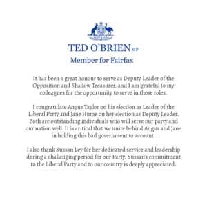 - STATEMENT ON LEADERSHIP BALLOTTED O’BRIEN MP DEPUTY LEADER OF THE OPPOSITION SHADOW TREASURER MEMBER FOR FAIRFAX MEDIA RELEASE It has been a great honour to serve as Deputy Leader of the Opposition and Shadow Treasurer, and I am grateful to my colleagues for the opportunity to serve in those roles. I congratulate Angus Taylor on his election as … Continued